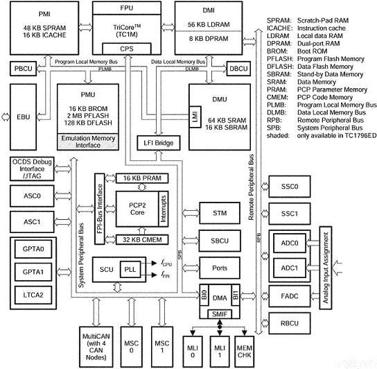 由于微控制器时钟速度的加快,调试和校准变得更加地困难。嵌入式仿真设备能够为汽车电子设计工程师提供高度集成的系统级芯片(SoC)微控制器内部的可视性。 自动代码生成工具能够通过基于图示模型之上的设计生成C代码。对该工具越来越多的使用可以节省软件工程投入的时间,但同时也给软件工程文化带来巨大的变化。 软件工程师将现有的模块组合在一起,建立成一个系统,并对该系统作出检测。与把定制的模块写入一个系统中以满足系统要求的方法相比,该方法的效率更高。对该通用的模块化软件的再利用提高了开发效率和软件质量。但同样也导致结构松散,存储器效率低下,长时间的延迟及将设计过程从硬件中抽象出来。 在不改变基本软件的情况下,这些系统的性能能够转变成不同版本的机械硬件。一般情况下,这是通过将许多校准了的变量包括在内而实现的,因此才能够在运行期间使能或禁止功能,调整增益,同时在运行时改变查找表。 软件工程师依靠仿真技术来跟踪真实系统中的程序流程,关注随时更新的数据,测量延迟,并且排除逻辑错误。但是,在为这些系统除错时,由于时钟速度过高,给多内核存储器系统级芯片的集成带来了一些挑战。 设计障碍 嵌入式非易失存储器的体积持续增大,硅片的几何形状持续缩小,使得规模大的系统级芯片微控制器能够与应用广泛的高速内部总线连接在一起,并通过这些总线将信息反馈给多个具有高速缓冲存储器的流水线型内核存储处理器及协调处理器。该体系同样能够使微控制器子系统能够被集成到更深层次的应用环境。由于存在物理连接问题(有时甚至连一根外部总线都没有),以及时钟速度过高、电缆长度及环境温度等因素,将分析设备集成到深度嵌入式器件的外部总线上的难度很大。 在许多情况下,可通过外部总线察看的外部取数情况并不代表整个程序的流程,因为内部高速缓冲存储器及流水线能够对取数做出预测。突发模式闪存同样由于假定的连续地址增量使得所获得的数据的解码变得更加复杂。 连接仿真系统时的首要问题在于连接长度受到限制,因为系统时钟的速度过高。例如,如果使用一个频率为150MHz的微控制器,那么,50cm长的连接线造成的传输时间延迟大约为2.0ns,但是时钟周期仅为6.67ns,所以2.0ns的单向延误时间是相当巨大的。由于在这些高频率器件中,连接线扮演着传输线的角色,并且它们的终接阻抗是无法得到保障的,因此,这看似短暂的时间几乎妨碍了任何远离目标器件的控制功能。在这个例子中,想要忽略传输线造成的时间上的延迟,线路的最大长度不能超过16cm。所以,在线仿真器(ICE)具有与被测发动机电控单(ECU)相同的环境需求。 Ingineon公司的TC1796产品即为此类系统级芯片实现的一个很好的例子。32位的TriCore中央处理器(CPU)拥有代码和数据分别独立的总线,并且通过LFI与系统总线桥接起来,建立起一个与外设子系统相连的数据通道。此外,还有一个通过直接存储器存取(DMA)与远端外设总线相连的通道。 外设控制处理器(PCP2)也是一个32位的CPU。同样的,该处理器也有独立的通常无法看见的数据和程序总线。该处理器的子系统的最高频率为150MHz,外设子系统最高频率为75MHz,因此,它有两个时钟区域。该器件被封装于一个416引脚的球型格栅极阵列封装中,能够提供标准的JTAG除错接口以支持除错功能。但是,要完全仿真这样一个微控制器,需要能够检验与外部针脚不相连的许多不同内部总线之间的数据交换。巨大的嵌入式存储器(2Mb闪存)有广泛的内部取数路径(128位)和局部高速缓冲存储器。因此,内置存储器的执行比外置(32位存取)存储器快得多(见下方TC1796方框图)。