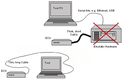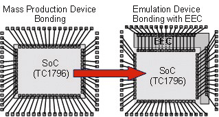 仿真设备使用一个原始生产器件的宏指令,完成所有的一般性功能、外设及端口,接着在外缘添加一个512K的静态随机存取存储器(SRAM)、几个总线观察模块(BOB)及一个拥有一些本地存储器来控制仿真器的局部CPU(在此情况下为另一PCP2)。若干高速串口,包括USB、JTAG和Micro-Link端口提供了外部连接口。该附加的线路,也叫EEC(仿真扩展芯片),在大规模生产器件发生改变时,使得仿真器很容易被重新设计,因为互连点并没有发生变化。 传统的外绑器件的另一常见问题在于封装的大小。仿真设备被特别设计成与标准的生产器件占位面积相符合,并且拥有一组额外添加的针脚来提供更多的信号。同时,还给封装直接添加了一个顶端连接,通过可移动的连接器就可以采集相同的信号,下方图象分别显示了大规模生产器件封装(顶端)及仿真设备封装(底端)。