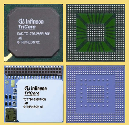 多总线及多内核存储器的复杂性意味着,只有一个外绑器件(现场可编程门阵列, FAPG)才能够达到完全除去系统错误所需的可视度水平。但是,如前面所讨论的,频率为150MHz的总线周期仅为6.67ns,一个外置的外绑控制器在这段时间内要接收总线信息,并对其解码,还要决定需要触发的中断及暂停处理器,因此,给予控制器的时间是远远不够的。在这种情况下,解决问题的方法就是将仿真器安装于外绑器件中,形成所谓的仿真设备(见下方对比图:左方为大规模生产器件,右方为拥有仿真扩展芯片的仿真设备)。
