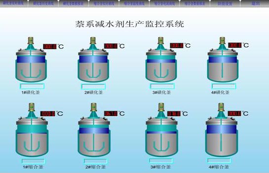 2、 实时动态显示各设备运行状态,包括4个磺化釜和4个缩合釜的温度、电流、液位等的实时变化,各种物料的给料流速,阀门动作情况等。模拟流程图形逼真、直观。
