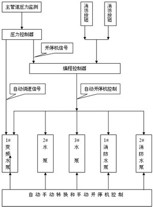 图3 7.2压力高停机情况:因与7.1类似,只是顺序相反,在此就不再给出了。 7.3消防控制优先,只要有消防信号,系统就执行紧急增压功能,不再进行加减机调压。 8.如图1所示,控制编程情况说明如下: 8.1程序设定是按照一定顺序开机或停机的,1#变频机开到最大后,如果压力低于设定值,压力控制器就输出低报警给编程控制器,编程控制器按设定好的顺序开机(此处先开2#机,再开3#机),开机后管道增压,并由1#变频机调压,由压力监测器反馈到压力控制器,与设定值进行比较,如果压力在设定值范围内,系统保持现状;如果压力值仍低于设定下限,编程控制器将按编程再开另一台水泵电机,同样由1#变频机调压,此系统正常生产最多需要开两台半不到三台就够了;如果此后由于系统用水量降低,使系统管道压力高于设定值上限,编程控制器按设定好的顺序停机(此处先停3#机,再停2#机),管道减压,并由1#变频机调压,由压力监测器反馈到压力控制器,如果压力在设定值范围内,系统保持现状;如果压力值仍高于设定上限,编程控制器将按编程再停另一台水泵电机,同样由1#变频机调压。如此循环往复,保持系统压力相对稳定。 8.2如果编程控制器接到消防指令,将直接开启消防泵,同时不再根据原压力设定进行调节,保持高压大量供水,直到再接到消防停机指令,然后又进入正常压力调节程序。 9.实施: 我们所用的这种编程控制器,编程简单,应用方便,因此实施起来没有太多太多困难,只要根据生产实际中多数时间的用水情况,设定合适的压力控制点和上下限,再根据用水变化程度,设定开停机间隔时间,按一定的逻辑关系实现开停机控制,并实现消防信号优先,就可以达到正常生产时基本恒压供水,消防时快速增压,保障特殊情况用水压力及用水量。施工难点主要是到各车间的消防控制,线路较长,控制点多,为保障正常生产,消防按钮特殊管理,一般情况不允许动。 10.实施效果: 11.结束语 |
