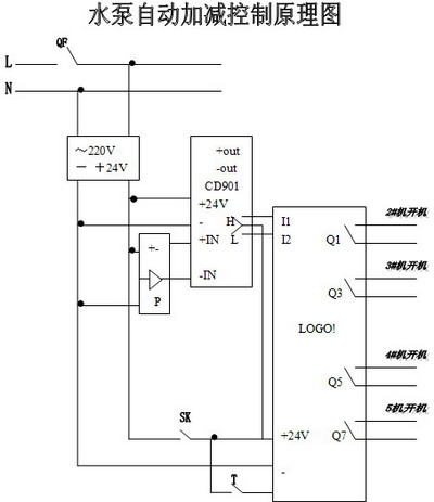 | 摘要:系统由压力传感器、压力、可编程控制器、水泵、按钮等组成,编程控制器程序是按照一定顺序开机或停机,保持系统压力相对稳定。 关键词:LOGO!可编程控制器、水泵、压力、自控 Abstract:The system is composed of the press sensor、the press controller、the LOGO! PLC、pumps、buttons etc,the LOGO! PLC Open and close pumps by the certain sequence in order to keep the pressure of the system steady. Keyword:the LOGO! PLC、Pump、Pressure、automatic control 1引言 随着科学技术的发展,世界上各大公司相继生产出许多不同类型的可编程控制器,给生活和工业生产的各个领域实现自动控制提供了很多方便,其中西门子LOGO!可编程控制器就是应用起来比较方便的一种,它可以不需要借助其他工具就方便的进行编程,实现逻辑控制、时序等多种编程控制,应用起来方便实用,本系统中用压力传感器作检测件,用压力控制器(CD901)作为压力比较控制中间环节,与西门子可编程控制器(LOGO!)共同组成控制系统。 2应用背景 我公司动力二区由于用水情况的变化,有时需水量大,有时需水量小,供水压力将随用水量大小变化而不断变化的,由于用水量变化很大使管网压力波动非常之大,当用水量小时,即使只开一台水泵管网压力仍可达到0.35Mpa,致使管网憋压造成能源浪费。当用水量大时,又必须开两台甚至三台才能满足工艺要求,这就要求岗位人员时常观察管网压力,并根据情况人工开机停机,这样不仅压力变化较大和调节滞后,而且会浪费能源,还可能造成供水不足影响生产等情况。当厂区内出现火情时,用水突然增加,而且要求压力更高才能满足消防需要,往往是出现火情后,由发现火情人员通知动力值班员,再由动力值班员去泵房开泵增压,由于过程多,不能及时增压,供水不足影响扑救工作,很可能延误时机造成更不利的局面,后果可能不可收拾。 3系统控制方式 3.1手动状态: 3.2自动运行: 4控制功能的实现 正常生产时,3台水泵并联运行,实现恒压供水;有火情时,通过布置在各车间的消防控制按钮,实现立即开启另两台消防泵增压,保证生产、消防两不误。系统中用一台LOGO!编程控制器进行协调,现场压力信号经压力变送器取样,送至压力控制器与设定值进行比较,比较后产生压力信号到变频器,进行调压。若变频器不能满足压力调节,压力控制器产生高低报警信号,给LOGO!编程控制器启、停相应水泵,以保证压力稳定。 5.联机方式: 下面给出系统各部分联机方式,以便大家了解整个系统,联机方式如下图: