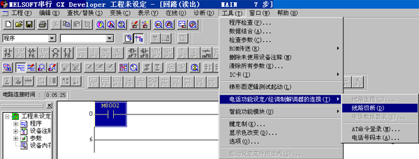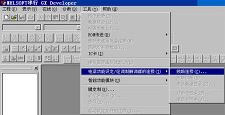 当使用GX Developer软件(Version 7.08J)时: 1. 选择“工具”/“电话功能设定/经调制解调器的连接”/“线路连接…”。