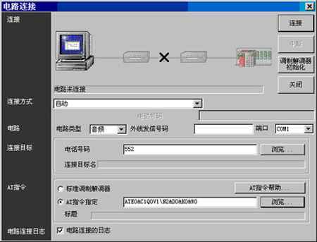 3. 在出现的“电路连接”对话框中指定“电路类型”,“端口”,“电话号码”和“AT指令”。