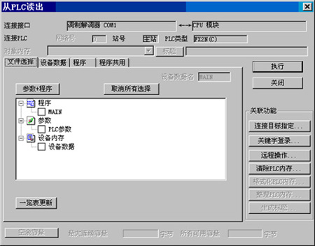 6.此时会出现“从PLC读出”对话框。在需要读出的项目前打勾,点击“执行”后将从 PLC中读出对应的内容。