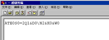 控制Modem的所有指令都以AT开始,最后以回车来执行它们,因此称其为AT指令。 AT指令前缀的两个字符都应以大写或小写(AT或at)输入,Modem无法辨认At或aT。 以上连接中所使用到的AT指令的含义: E0:命令字符串不回送。 Q0:返回命令执行结果。Q1:不返回命令执行结果。 V1:以字符形式返回命令执行结果。 &C1:数据载波侦听(DCD)信号将随着远程调制解调器送来的数据载波变化而变化。 &D0:DTR永远保持在ON,调制解调器忽略DTR信号。 &K0:禁止数据流量控制。 &W0:将目前所作的参数存入调制解调器的第0组参数表。 \N2:选择MNP可靠模式的数据链路。 S0=2:调制解调器接收到2次振铃信号后自动接听。 &V:显示当前的调制解调器参数。 &F:恢复到出厂设置。