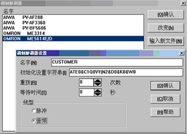 2. 在出现的“调制解调器”对话框中点击“输入新文件”,在随后出现的“调制解调器设置”对话框中设置好“名字”,“初始化设置字符串”及“线型”并确认。