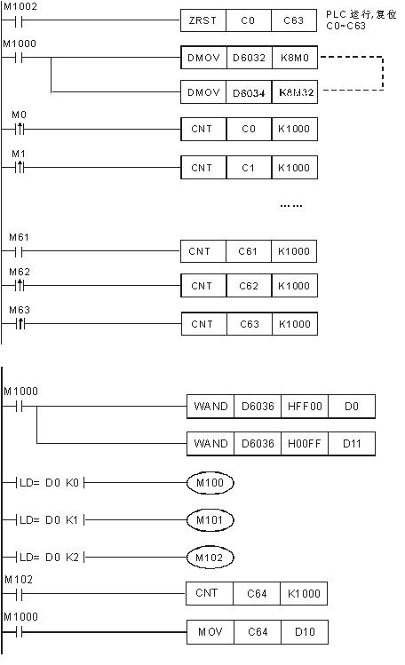 当扫描列表中的节点正常时,相应的位为OFF状态,当扫描列表中的节点发生异常时,相应的位为ON状态。用户通过监控D6036的内容实时获取主站模块的状态信息。当主站模块正常工作时,D6036的内容为0;当主站模块处于初始化时,D6036高字节内容为1,低字节内容为0;当主站模块发生错误时,D6036高字节内容为2,错误的详细信息参考D6036低字节的错误代码 :