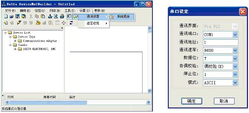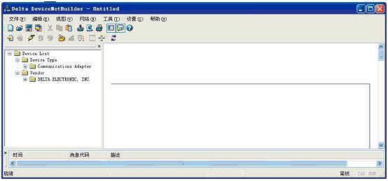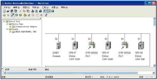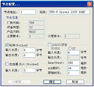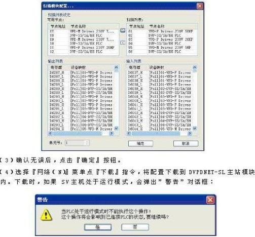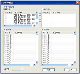 3.1 DeviceNet从站配置 (1)打开DeviceNetBuilder软件,软件界面如下所示。 (2)选择『设置(S)』功能点『通讯设置』,选择『系统通道』指令。 (3)在此对计算机与 SV 主机的通讯参数进行设置。如”通讯端口”、”通讯地址”、”通讯速率”、”通讯格式”。设置正确后,点击『确定』按钮,返回主界面。 (4)选择『网络(N)』菜单点『在线』指令。 (5)弹出下所示窗口: (6)按『确定』对DeviceNet网络进行扫描,正常情况下弹出扫描进度条,如下图所示。按『取消』返回主画面: (7)如果上述对话框的进度条一直没有动作,则说明 PC 和 SV 通讯连接不正常或PC上有其他程序使用串口。扫描结束后,会提示”扫描网络已完成”。此时,网络中被扫描到的所有节点的图标和设备名称都会显示在软件界面上,在此例中DVPDNET的节点地址为01,如下所示: (8)用鼠标双击VFD-F Drives节点,弹出下图所示窗口: (9)在此对 VFD-F的识别参数以及IO信息进行确认。确认配置无误后,点击『确定』按钮。返回主界面。 其它从站(如等)的配置与节点1操作步骤类似,这里不再赘述。 3.2 DVPDNET主站模块(主站)的配置 (1)双击DNET Scanner(节点0)的图标,弹出” 主站模块配置…”对话框,可以看到左边的列表里有当前可用节点VFD-F Drives 230V 50HP,DVP-SS/SA/EH ,VFD-F Drives 230V 20HP,DVP-SS/SA/EH ,VFD-M Drives 230V 5HP,DVP-SS/SA/EH … …。右边有一个空的”扫描列表”: (2)将上图中左边列表中的 DeviceNet 从站设备移入主站模块的扫描列表中。具体步骤为:选中 DeviceNet 从站节点,然后点击" >",如下图所示。按照此步骤,即可将 DeviceNet 从站节点依次移入到主站模块的扫描列表内: (5)点击『是』按钮,将配置下载至主站模块,确认处于RUN模式。 3.3 DVPDNET-SL主站模块和从站的IO数据映射 DVPDNET-SL主站模块→DeviceNet从站