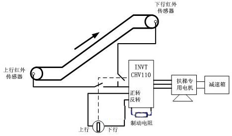 对于客用自动扶梯,一般使用高峰期出现在下午及晚间时段,其余时段使用率较低,具有相当节能空间。根据以上改造原则,从投资成本及自动化水平两方面考虑,拟使用以下变频拖动方案:采用英威腾CHV110一体化变频节能柜(扶梯专用)驱动电梯主机,变频器采用多段速控制模式,并设置主频率(低速)、多段速频率1(高速)两种运行频率;