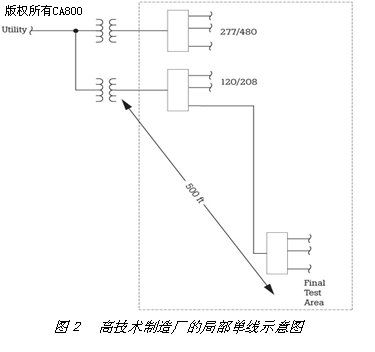 于是,承包商画了一个系统的单线示意图。示意图显示,为测试区域供电的变压器在大厦内相对的另一端――大约有500英尺的距离(如图2)。该变压器的多数负载是非线性的,在电压的峰值处,他们都吸收高峰值电流。高峰值电流和最后的高阻抗相结合,在电路的末端产生了严重的电压斩波――正好是测试区域所在位置。