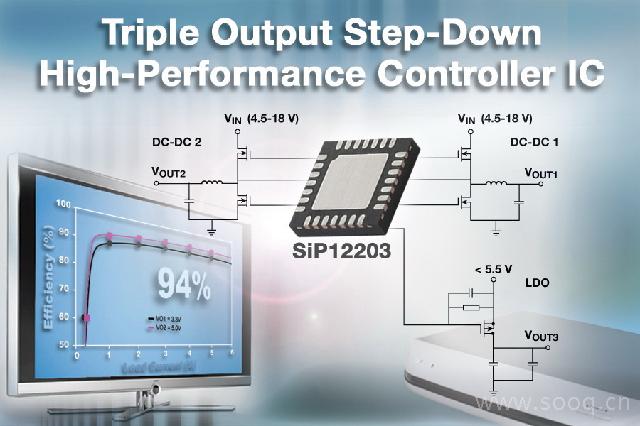 Vishay的新型 SiP12203 的同步降压架构可使电压以高达 94% 的高效率进行转换。该器件具有 4.5V~18V 的输入电压范围,两个独立的输出可提供低至 0.6V 的可调电压,其可实现 180° 异相运行,从而降低 EMI 及 RMS 输入电流。该 IC 的第三输出为内置 LDO 控制器,其可在线性模式下控制分立 p 通道 MOSFET,且可实现高达 1A 的输出电流。