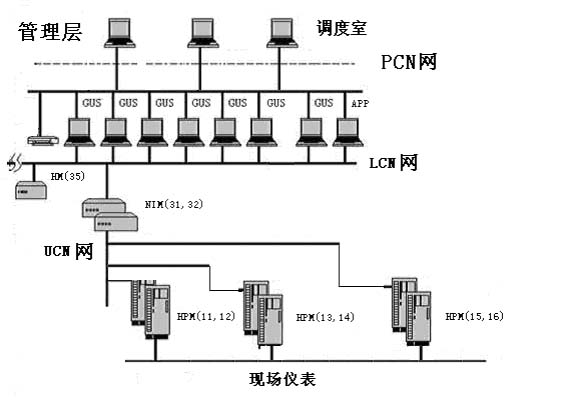 TPS系统主要由GUS(全方位用户操作站)、HPM(高性能过程管理站)NIM(通讯网络接口)、HM(历史模件)、AM、打印机和通讯网络PCN、LCN、UCN等组成。以我厂TPS系统为例,系统配置图如下: