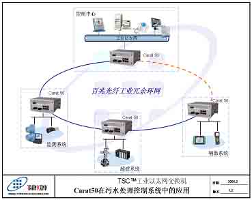 由于该污水处理厂各站的距离较远,加之对设备的数据交换能力和实时性要求较高,因此选用卓越信通TSC Carat5008FC2系列工业以太网交换机组成光纤冗余自愈环网,为各站的监控、采集数据提供了快速冗余的以太网通道。