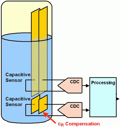 在一个液位传感器中,一对固定的导板浸没在要测量的液体中。制造商能够以非常低的成本制造出印制导体。第二对导板附着在底部,可以检测出由于温度或其他影响导致的电介质变化,如下图所示。
