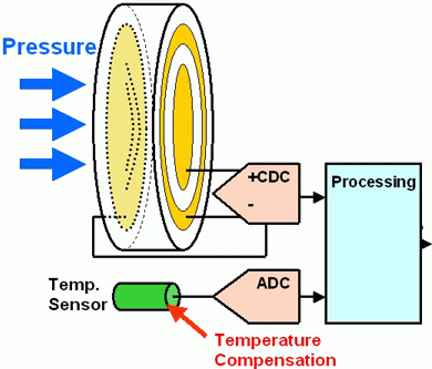 由于热扩散,温度传感器需要考虑改变的几何形状。设想两个电极中的一个附着在芯片上,另一个附着在由金属或陶瓷构成的支架上,因此支架自己作为传感器。以陶瓷为例,能够承受非常高的压力和侵入的媒介。与经典的惠斯通电桥相比较,电容压力传感器的主要优点是对输入电流的要求更低,使得他们特别适合于诸如轮胎压力控制之类的应用。