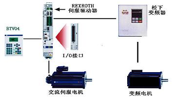 德国REXROTH伺服飞剪系统由人机界面BTV04、伺服驱动器DKC01.3,交流伺服电机MKD090B和FLP运动控制卡组成;并应用伺服驱动器自带的两路模拟量之一来控制进料牵引变频器。系统基本组成如图1-1所示: