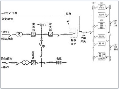 图2 双电源供电 1991年,黄埔发电厂6号机组于UPS安装后期进行切换试验时,跳了许多开关,才第一次发现了相位不符、切换短路问题。其他电厂也有类似接错相位的情况。 必须指出,安装时接错了相位,不遇到UPS电压异常情况下的切换或回切,是不会觉察的。甚至许多开关跳闸了,若恢复时从UPS侧先送电(一般均如此),APS侧后送电,此时不会短路,仍掩盖了这个极大的隐患。 我们希望设计和施工部门,注意这一问题,图纸上标明相位,正确接线,防止类似现象重演。 2.3 APS的两路电源 APS1,APS2电源来自不同的变压器,不允许长期并列。如图1,一般应合上Q1,Q2,断开Q3。如果将Q1,Q2由手动操作改换为电动操作,或者加串交流接触器,联锁自投,还可以降低DPU和计算机站失电的概率。 2.4 UPS装置的冗余配置 有的电厂工程,制造厂商在旁路电源上加配了一套交流稳压器。有的技改工程,在APS侧另加1套UPS,1台机组用2套UPS装置。 看来UPS电源的配置方案,值得商榷。笔者认为: a)使用UPS的目的,并非发电厂的电压质量不能满足计算机系统的要求,而主要是为了不停电。1套UPS装置,本身已有电池和充电器冗余备用,旁路电源只是在逆变器输出故障情况下暂时起作用。计算机系统有时发生“掉站”和芯片元件损坏事件,非旁路电压波动所致。计算机系统各站主机硬件,带有自保护功能。旁路电源系统应该简化,而且可以简化。 b)逆变器是UPS系统的“瓶颈”。从多年的运行经验看,逆变器的控制部分故障率相对较高。有条件的工程,可以考虑1套UPS装置配2套独立的逆变器。双逆变配置,比旁路稳压器或2套UPS装置的方案,更合理、实用、简单。 c)热控重要负荷才需要接入UPS母线,而最重要的负荷(DPU和计算机站)则由UPS和APS双侧电源自动切换供电。APS侧再加1套UPS装置的方案是不可取的。如果硬要双UPS,其输出均应接UPS母线。 d)UPS装置的配置,力求科学合理。提高UPS的可靠性,不能过多依赖增加备用设备,而要从维护和管理上下功夫。冗余太多令装置复杂化,投资增加,利用效率却很低,故障率也可能更高了。 3 系统容量估算选配 3.1 UPS的输出容量 欲使UPS的容量确定得比较恰当,须进行详细的负荷统计,并搜集同型运行机组的实际资料。 负荷统计,需要搜集负荷的同时率、功率因数、经常性电流和最大可能的冲击电流等资料。 UPS的逆变器设有过载保护,输出电流超过(1.2~1.25)In时,将自动切换至旁路供电。为了避免多台负载同时启动迭加冲击电流,频频出现切换及回切,而且主回路元件不至于过热,UPS容量留有足够的余地是必要的,但容量富裕应有度。 黄埔发电厂300 MW机组UPS的输出容量,初拟30 kVA,136 A。与美国西屋公司洽谈后改为50 kVA,227 A。投产后的实际负荷,交流侧一般为90~100 A(直流侧约125 A),偶而达110~120 A。如选30 kVA,136 A,负荷率为110 A/136 A=0.73,容量有点偏小。如选40 kVA,182 A,负荷率为100 A/182 A=0.55,低于规程推荐值0.6,裕度系数为182 A/100 A=1.82,高于推荐值1.6,才是比较恰当的。 3.2 整流器(充电器)输出容量 UPS设备的功率关系见图3。