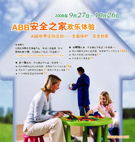 为突出ABB整体家居安全概念,配合微型断路器、配电箱产品,体现ABB产品对家居电路的整体保护,ABB(中国)有限公司低压部在北京、广州、成都等十余个重点城市推出“ABB安全之家欢乐体验”的十一促销活动,活动从9月27日开始,一直延续到10月26日,贯穿整个秋季装修旺季。