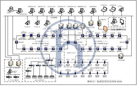 南京梅山钢铁厂能源控制系统,分区域采用赫思曼的HIPER-Ring超级冗余环,环与环之间采用环间冗余的方式进行连接,环网通讯介质采用百兆单多模光纤。控制级网络设备通过网关服务器与控制中心的操作站、上位机进行通讯。底层的PLC和控制器等设备通过现场总线相互通讯。整个梅山钢铁的能源控制系统按分类型、分区域的三级网络构成。