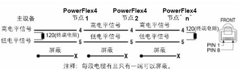 这就是我们PowerFlex 4系列变频器一卡多机技术的优势。每5台变频器只需要一只DeviceNet通讯卡即可形成网络连接。如上图所示,其中4台变频器是通过变频器自带的RS485接口通过菊花链的形式连接到DeviceNet(EntherNet亦可)通讯卡上的,这样25台变频器就只需要配置5只DeviceNet通讯卡。