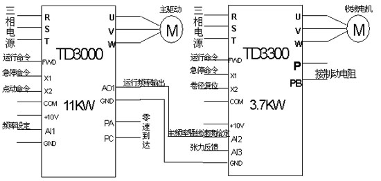 A、拉丝机的主驱动选用TD3000 11KW变频器,采用端子控制、模拟速度设定,模拟输出端子AO1设定为运行频率输出,用来作为收线变频器的频率主给定和线速度反馈信号。可编程继电器设为零速到达信号输出,控制系统的抱闸,X1端子设定为自由停车端子,用做非正常情况下的停机信号。