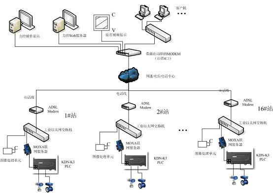 系统主要由力控监控软件、MOXA串口联网服务器和凯迪恩 PLC构成,这种方式的主要特点是结构分散、开放性好、稳定性强、性价比高并且扩展容易。力控软件主要负责数据采集、通讯处理、人机界面和WEB发布等工作;串口联网服务器负责将PLC的串口通讯转为以太网通讯,并将数据通过ADSL网络传递给力控软件;凯迪恩 PLC负责现场仪表和设备的通讯及数据采集和控制。主要工作方式:力控软件设在中央数据中心,数据中心有一个固定的外网IP,力控软件采用典型的C/S和B/S结构,B/S方式是作为WEB服务器,将实时数据和画面通过WEB进行发布,远端用户经过授权,无须安装任何插件,使用标准的浏览器通过固定IP或域名绑定进行访问即可在远程进行监视。C/S方式是力控软件作为标准服务器端与各分站的多个客户端(MOXA串口联网服务器)进行通讯,建立连接时由串口联网服务器主动向拥有固定IP的服务器端发出连接请求,服务器进行应答,建立网络连接之后,由力控软件主动向下位的凯迪恩 PLC发出请求,通过标准MODBUS协议与凯迪恩PLC进行通讯,MOXA串口联网服务器在中间起到透明转发的作用。整个通讯系统的拓扑结构如下图: