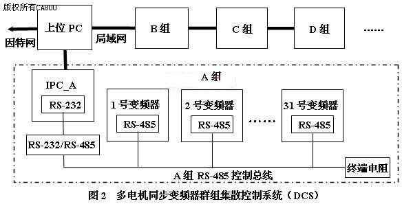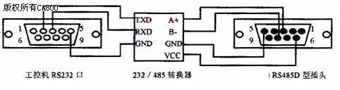 系统的总体设计方案如图2所示,其中RS-232/RS-485转换器如图3所示。对于要求同步的那些多单元拖动电机都采用交流变频调速,并且将这些智能型变频器分成一个组(最多31台),由工控制机IPC(现场工作站)通过RS-485总线通讯设定各变频器的运行参数实现同步控制。上位PC机和IPC分别安装网络版MCGS工控组态软件,这样由计算机和变频器群组通过网络组成集散控制系统即DCS。通过上位机和工作站可以对每一台变频器的运行参数进行读取,改写和显示,同时对电动机的运行情况,如定子电流、电压、频率等参数,进行监视、显示、存储和打印等。