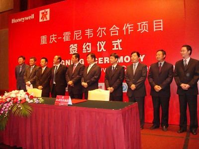 (2008年9月26日,重庆) 今天,霍尼韦尔在希尔顿酒店分别和重庆燃气(集团)有限公司签署了燃气调度中心节能改造合同,以及和重庆长安汽车股份有限公司签署了发动机增压项目合作意向备忘录。重庆市市长王鸿举和前来重庆参加市长国际经济顾问团年会的霍尼韦尔全球副总裁兼中国与印度首席执行官沈达理出席并见证了签约仪式。一系列的签约将霍尼韦尔和重庆市在节能减排领域的合作又推向了新的里程碑。“节能减排是一件‘功在当代,利在千秋’的事情,希望我们的共同努力不仅有利于当今社会的持续繁荣,更将为我们的子孙后代,为地球家园营造绿色的未来。”沈达理表示。