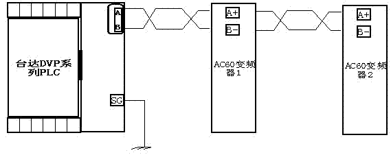 (2).用外带屏蔽的双绞线连接PLCA+/B-到AC60变频器A+、B-端子上;