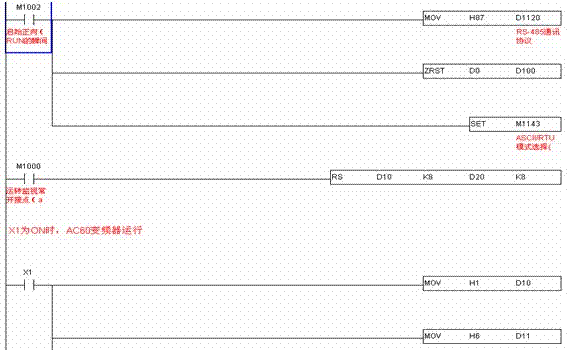 台达PLC与AC60变频器进行MODBUS(RTU)通讯时,会用到一个很方便的指令。即MODRW指令,无需在用户程度内编写CRC校验子程序,只是将要传输的每一组数据用MODRW指令写入即可。(另需在编辑寄存器D内写入数据内容)。伟创AC60变频器内置的MODBUS协议采用RTU传输格式,只是采用了部分MODBUS从协议(只支持03、06、08H这三种命令)通信速率比ASCII模式更快。该格式使用CRC校验方式对每次发出或接收的数据帧进行校验。