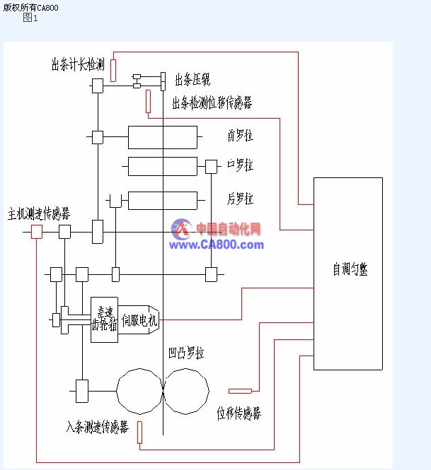 该机构由差速齿轮箱、伺服电机及伺服控制器组成。从图1中可以看出,输入差速齿轮箱的速度是恒定的,而伺服电机的转速是变化的,这样使得差速齿轮箱的输出转速发生变化,从而改变了中罗拉以后的传动机构的转速,也就改变了主牵伸区的牵伸倍数。以达到对棉条匀整的目的。这里重要的是伺服系统的精度、响应时间、动态特性等参数。对伺服系统的要求是:惯性小、转矩大、免维护、响应速度快等。本装置选用的是日本SANYO公司的交流伺服系统,精度高,响应速度快,动态性能好。满足了系统的使用要求。