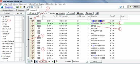 1)、图3中①所在的部分是滤波器,因为vspy可以同时监控多种网络数据,该滤波器基于网络类型滤波,例如,勾选HSCAN,则监控界面将只显示HSCAN类型网络数据。
