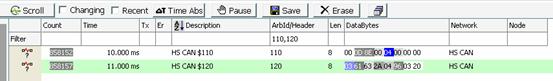 2)、图3中②所指的栏为滤波栏,在该栏中可以更灵活实现滤波功能,如根据报文名称,ArbID等滤波,支持“?”“*”等符号,比如现在我们只想监控Arb ID为110和120的报文,则只需要在ArbID栏输入110,120则可,如图4所示: