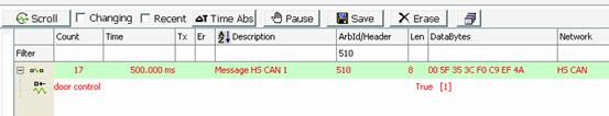 通过以上的介绍,相信有经验的工程师已经看出这款产品在总线数据解码方面的优越性。对于车载CAN总线,由于CAN报文的优先级取决于ArbID,ID值越小,优先级越高,这为我们揣测报文是来自于车载上的哪个ECU提供了依据,由于vspy可以实时无遗漏地监视总线通信报文变化并能以各种颜色来区分数据变化的快慢,因此我们可以通过反复动作车辆来观察报文变化情况,如开关车门,开和关会引起某个数据字节中的某位产生状态变化,由于这种变化是非连续性的快速变化数据,在监控界面中必然会以蓝色背景显示,因此我们可以在开关车门的时候在监控界面查找有蓝色变化的报文,并将这些报文用上述的滤波功能过滤出来以缩小监视范围,然后反复动作车门以确定是哪条报文的某位随着车门动作在变化,这将很容易辨别,在得出结论以后,再将该位提取出来并命名然后再动作车门以进行验证。当然,vspy提供解析报文的功能,比如我们判定图3中ArbID为510的报文中第二字节第二位表示车门开关,则可将该位命名为door control,并将该条报文设置为其它颜色,以方便观察,解析的结果如图5所示,对解析的结果,vspy还可以将其保存为标准的DBC格式。对于直接监视ECU之间的通信,则过程会简单的多。
