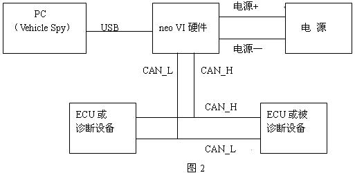 Vehicle Spy可以通过两种方式监控总线通信:通过车载的ODB接口监控汽车总线通信(图1)和直接监控ECU之间的通信(包括诊断仪和被诊断设备,图2)