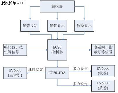 (2)EC20控制器:该控制器是艾默生公司的高性能控制器,它是整个系统的控制中心,协调外围设备的动作,并按用户设定的工艺控制设备的运作。通过EC20-4DA模块对变频器作张力给定和频率设定。
