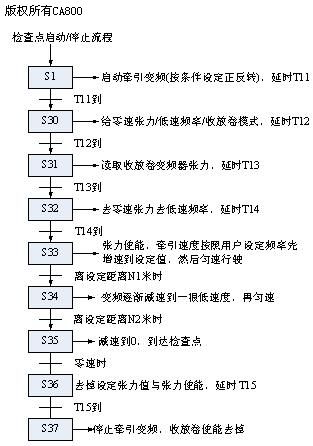 检查点流程主要是用于缺陷的查找,这也是该设备的最重要的功能之一,本系统是通过硬件中断的方法记录缺陷的位置的,所以,可以比较准确的发现缺陷的位置。由于本过程涉及到多次启停,而且在任何速度下都要保持张力稳定,所以对变频的张力控制性能要求很高。