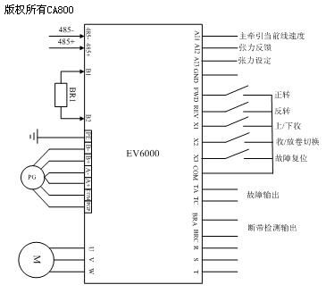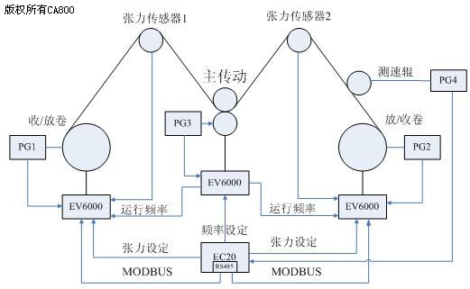 收、放卷变频器工作于张力闭环速度模式,EV6000自带卷径计算功能和断带检测功能。