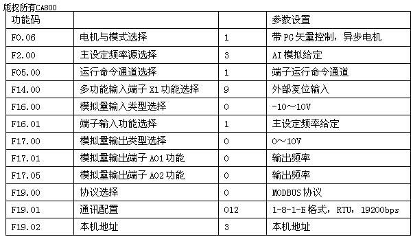 牵引电机选用的是艾默生高性能变频器EV6000-4T0220G,以下是该变频的主要功能码设置。