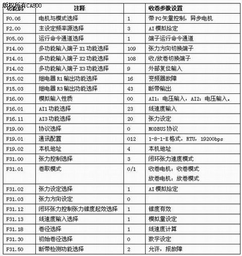 收放卷电机选用的是艾默生高性能张力专用型变频器EV6000-T-4T0370G,以下是该变频的主要功能码设置。