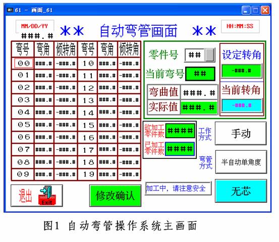 B、可存储上百种产品型号,每种型号可设定20个弯管角度参数和20个旋转角度参数,可满足多种复杂、多角度、不同空间的要求,并可对工作进度进行实时监控显示。如图1所示;