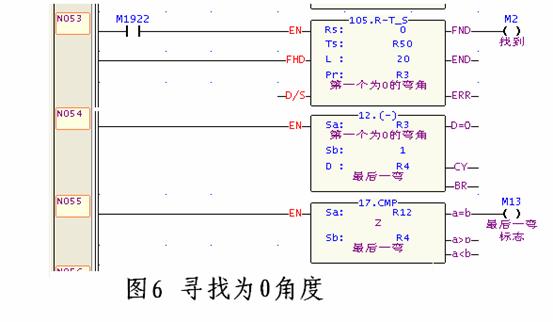 系统的每一个零件最多可设定20个弯管角度和20个空间旋转角度。由于每种零件的弯管角度不可能全部设定,当一种零件的弯管角度个数少于20个(即其它角度均为0),CPU将继续进行扫描,直至20角度全部执行完毕,这在很大程度上不仅浪费了CPU的扫描时间,也降低了系统工作效率。因此,在设计过程中,采用为0参数寻找方式,程序设计如图6所示,当20个参数暂存器中第N个为0时,M2=ON,此时R4的资料为第N个参数暂存器,并告知CPU执行到时结束执行弯管命令。