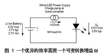 该锂离子电池具有一个介于2.7V~4.2V的电压范围。该电源的主要任务是为白光LED提供一个恒定的电流和一个典型的3.5V正向电压。 与充电泵解决方案相比,升压转换器可实现更高的效率 一般来说,用于驱动白光LED的电源拓扑结构有两种:即充电泵或开关电容解决方案和升压转换器。这两款解决方案均可提供较高的输出和输入电压。二者主要的不同之处在于转换增益M=Vout/Vin,该增益将直接影响效率;而通常来说,充电泵解决方案的转换增益是固定不变的。一款固定转换增益为2的简单充电泵解决方案通常会产生比LED正向电压高很多的电压,如方程式(1)所示。其将带来仅为47%的效率,如方程式(2)所示。
