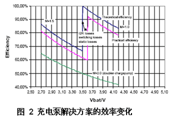 图2显示了充电泵解决方案在不同转换增益M条件下理论与实际效率曲线图。