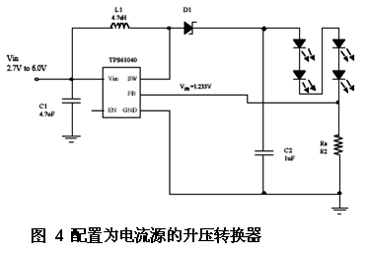 可变转换增益可实现一个刚好与LED正向电压相匹配的电压,从而避免了内部压降,并实现了高达85%的效率。 可驱动4白光LED的标准升压转换器 图4中的升压转换器被配置为一个可驱动4白光LED的电流源。该器件将检测电阻器Rs两端的电压调节至1.233V,从而得到一个定义的LED电流。