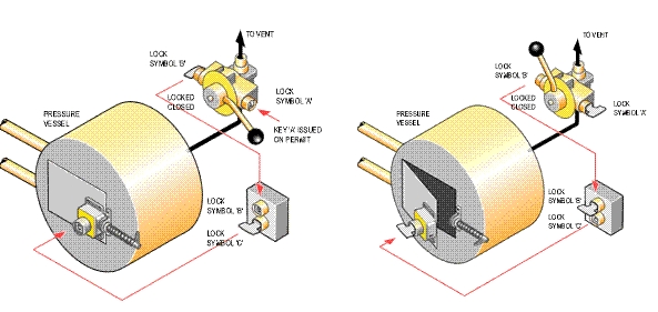 压力罐的进入点和卸压阀都被锁定,过程控制钥匙在控制室中保留。要进入槽罐,必须先从控制室中获得“许可证”。
