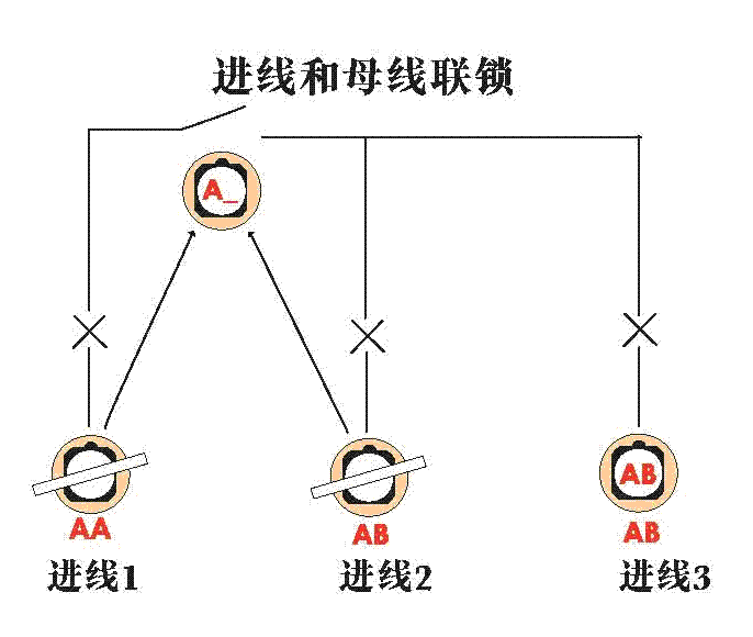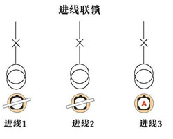 本系统共有三把锁两把钥匙。在正常操作时,两把钥匙被锁定在进线的“合闸”位置。本系统允许一路进线“分闸”钥匙取出。该钥匙取出后插入另一路处于“分闸”状态的进线并使其合闸。这就可以保证三个进线回路中只有两路同时合闸。