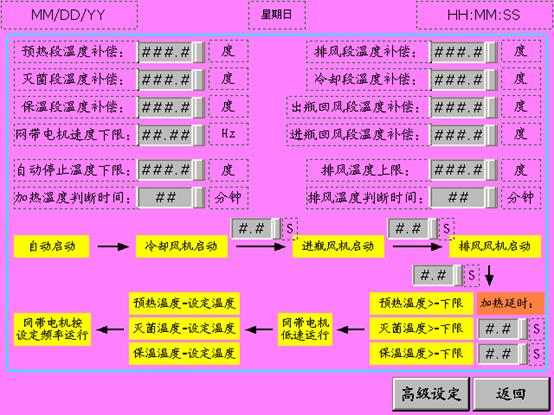 (2)自动启动。按下自动启动按钮后为自动状态,冷却风机启动,延时设定时间后,进瓶风机启动,延时设定时间后,排风风机启动,延时设定时间后,预热加热启动,延时设定时间后,灭菌加热启动,延时设定时间后,保温加热启动,当预热、灭菌、保温三个温度同时大于三个温度设定下限时,网带电机启动,频率按网带电机速度下限设定频率运行,当三个温度均达到设定温度 + -15度时,网带电机按设定频率运行。