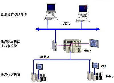 二、地源热泵空调简介 地源热泵机组是一种利用再生能源的高效节能、无污染的既可供暖又可制冷的新型水冷式空调机组,由压缩机、冷凝器、蒸发器、节流装置和其它制冷附件组成,是一种可以全天候运转的空气调节设备。地水源热泵利用地能或浅水层一年四季温度稳定的特性,冬季把地能作为热泵供暖的热源,把高于环境温度的地能中的热能取出来供给室内采暖;夏季把地能作为空调的冷源,通过能量转换地下热源转换成冷源。其原理是通过极少量的电能,实现能量的搬运转移。 由于于地下的温度在恒定在10—25度的,地源热泵机组的工况优于传统的空调的工况所以它能够更轻松的达到室内的温度要求和效果,所以地源热泵机组的能效比更高。因此,地源热泵空调更节能。 三、系统描述 国家体育场(“鸟巢”)为2008年第29届奥林匹克运动会的主体育场,地下3层,地上7层, 国家体育场地源热泵大型中央空调项目总体设计冷负荷为14533kw,采用地源热泵和冰蓄冷结合的形式。鸟巢地源热泵中央空调采用采用烟台冰轮和顿汉布什的制冷设备及系统,其电气控制主要采用施耐德的Micro 和Twido PLC,以及XBTGT触摸屏。 “鸟巢”地源热泵大型中央空调系统包含地源热泵机房控制系统和两台全封螺杆地源热泵机组。 四、电气控制系统结构与构成